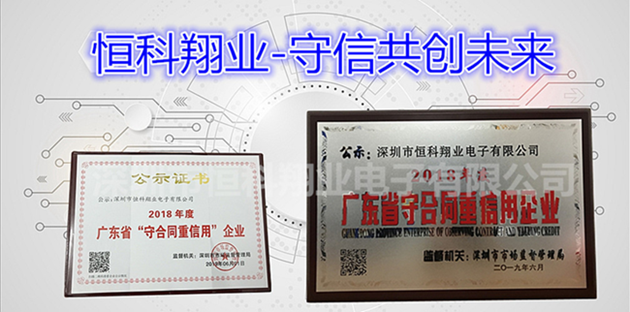 恒科翔业电子已连续两年荣获广东省“重合同守信用”企业